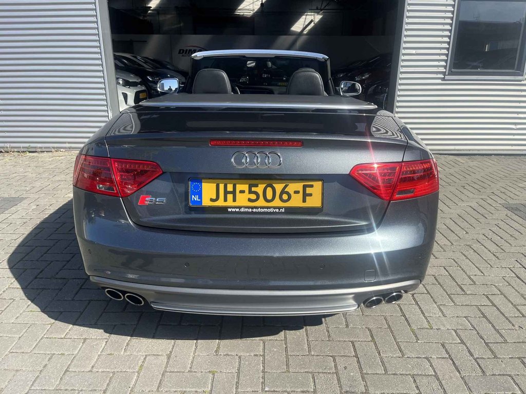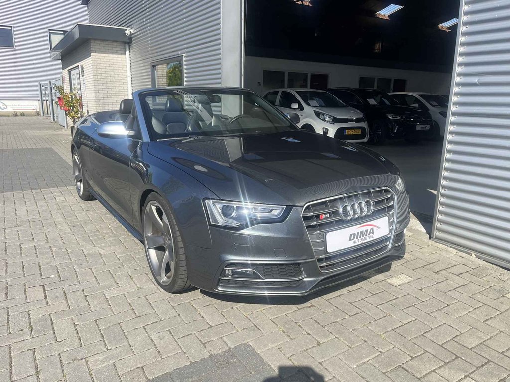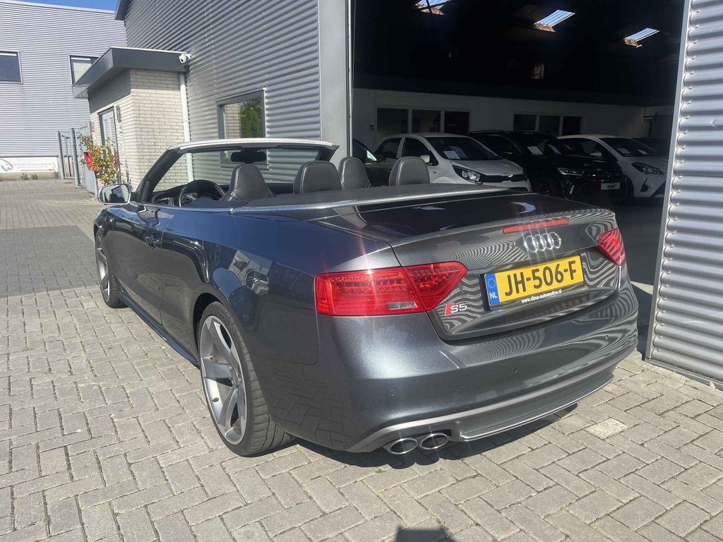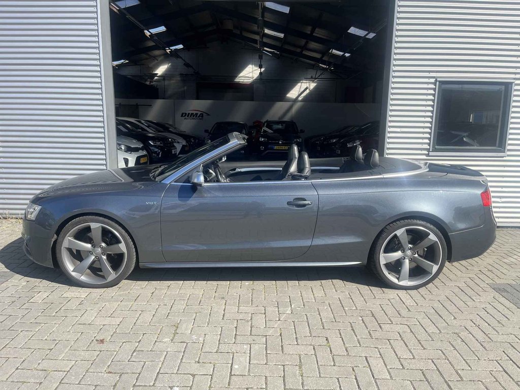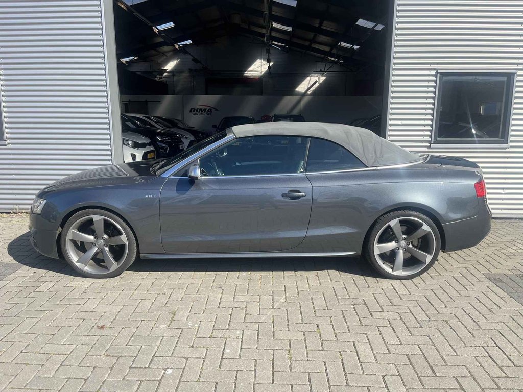 De Audi S5 Cabriolet vertegenwoordigt het beste van degelijk Duits design. Als u het over uitstraling hebt, dan kunt u niet om het effect van de S-Line styling heen. Hij heeft een benzinemotor en een automatische transmissie. Om het af te maken is deze auto voorzien van een lederen interieur. De verwarmbare voorstoelen zijn een heerlijke extra optie, waarmee u uzelf en uw bijrijder een groot plezier doet. Voor het pittige uiterlijk én goed gesteund zitten zorgen de sportstoelen. Kiezen tussen open en dicht rijden kan met een druk op de knop dankzij de elektrisch bediende cabriokap. Dankzij de xenonverlichting profiteert u in het donker van een krachtige en heldere lichtbundel. Bij de rijke uitrusting horen ook 20 inch lichtmetalen velgen, sportonderstel, elektrisch inklapbare buitenspiegels, verstelbare lendensteunen, verwarmde ruitensproeiers en metallic lak.