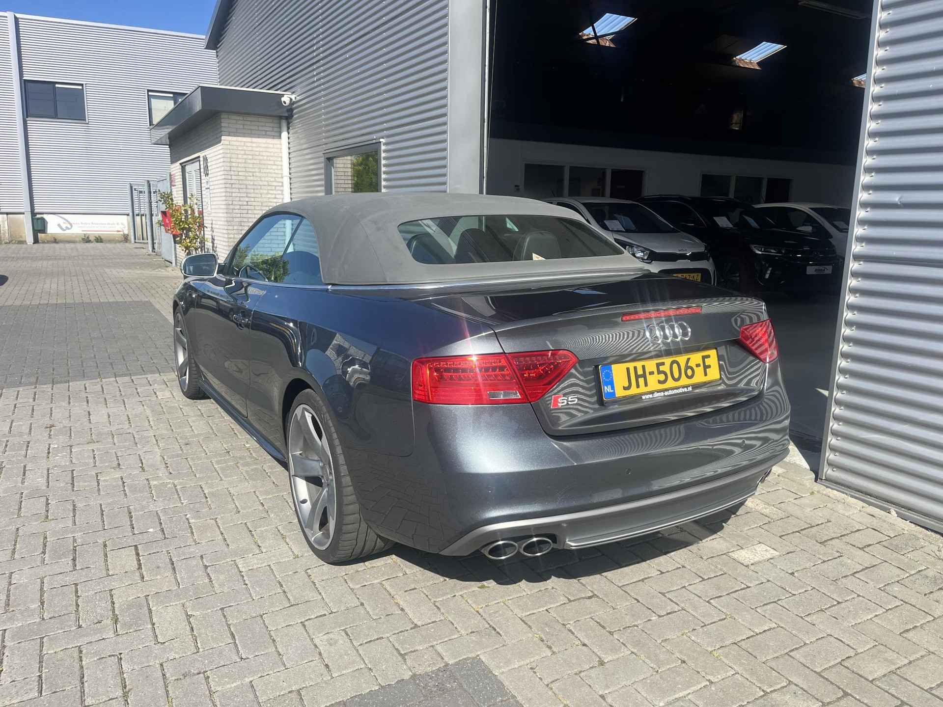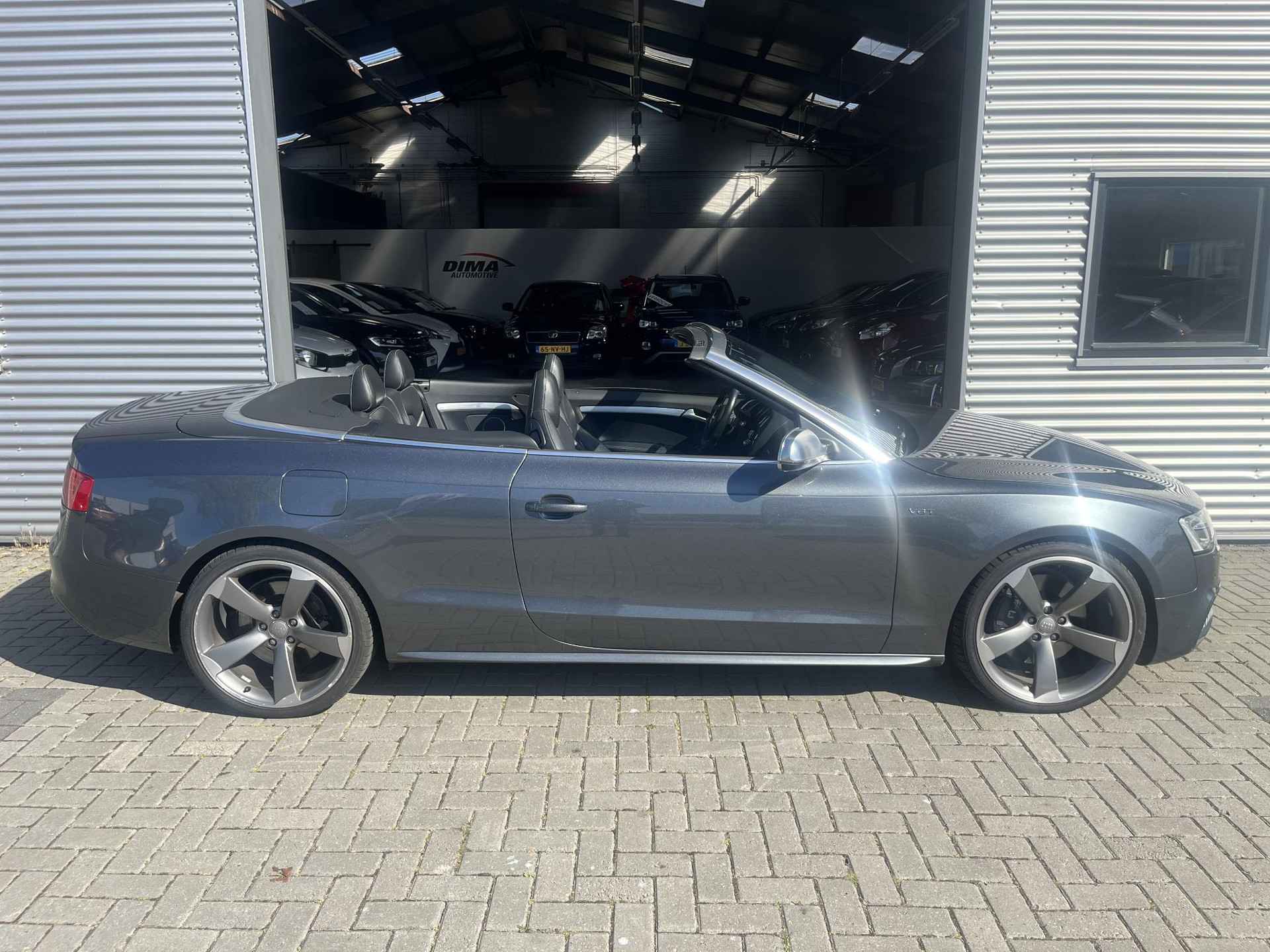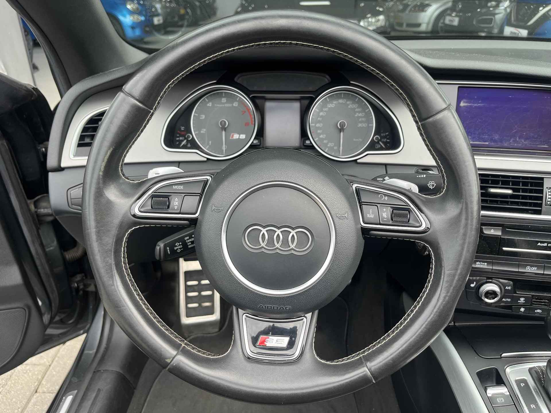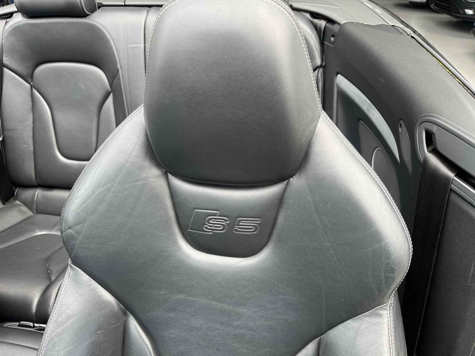 De Audi S5 Cabriolet vertegenwoordigt het beste van degelijk Duits design. Als u het over uitstraling hebt, dan kunt u niet om het effect van de S-Line styling heen. Hij heeft een benzinemotor en een automatische transmissie. Om het af te maken is deze auto voorzien van een lederen interieur. De verwarmbare voorstoelen zijn een heerlijke extra optie, waarmee u uzelf en uw bijrijder een groot plezier doet. Voor het pittige uiterlijk én goed gesteund zitten zorgen de sportstoelen. Kiezen tussen open en dicht rijden kan met een druk op de knop dankzij de elektrisch bediende cabriokap. Dankzij de xenonverlichting profiteert u in het donker van een krachtige en heldere lichtbundel. Bij de rijke uitrusting horen ook 20 inch lichtmetalen velgen, sportonderstel, elektrisch inklapbare buitenspiegels, verstelbare lendensteunen, verwarmde ruitensproeiers en metallic lak.